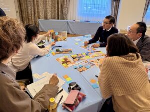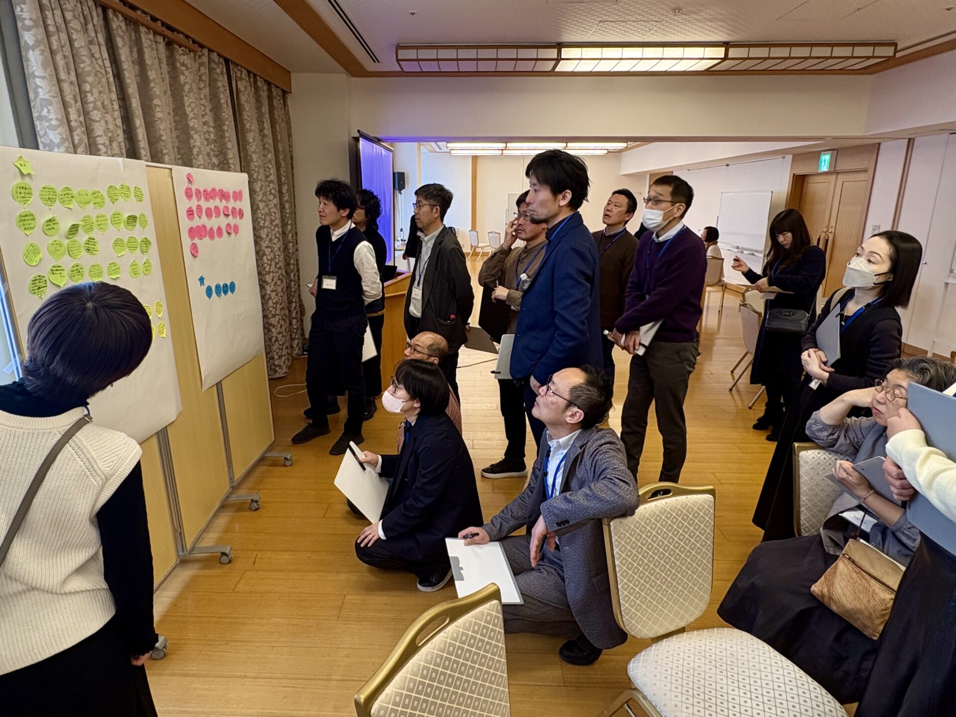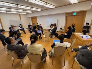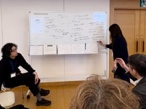 2日目午前は、前日の模造紙に貼り付けた付箋を全員で確認した後、各々が話し合いたいテーマを書き出し、一緒にテーマを検討したいメンバーを募って4グループに分かれて話し合いを進めました。全体共有の時間では、質疑応答や意見交換を行いました。