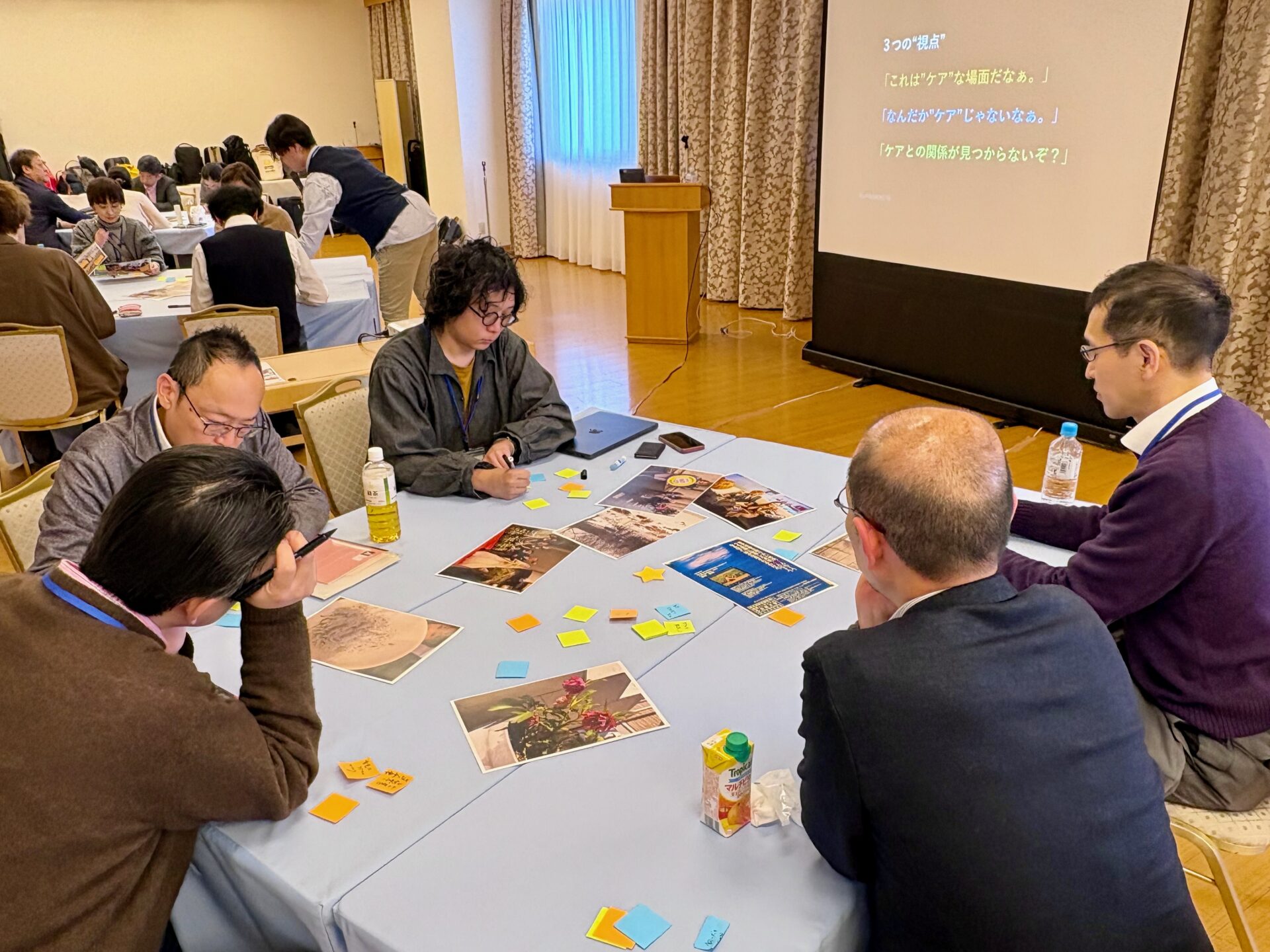 1日目は、研究代表者の八木絵香から開会挨拶をした後、事前に参加者から提出していただいた写真を題材に、ケアを考えるワークショップを行いました。3グループに分かれた参加者は、写真を眺めて抱いた視点を付箋に書き込んだ後、対話を通して異なる観点を確認し合いました。ワールドカフェ形式で3セット行ったワークにより、多様なケアの視点や気づきが得られ、参加者同士の交流にもつながりました。