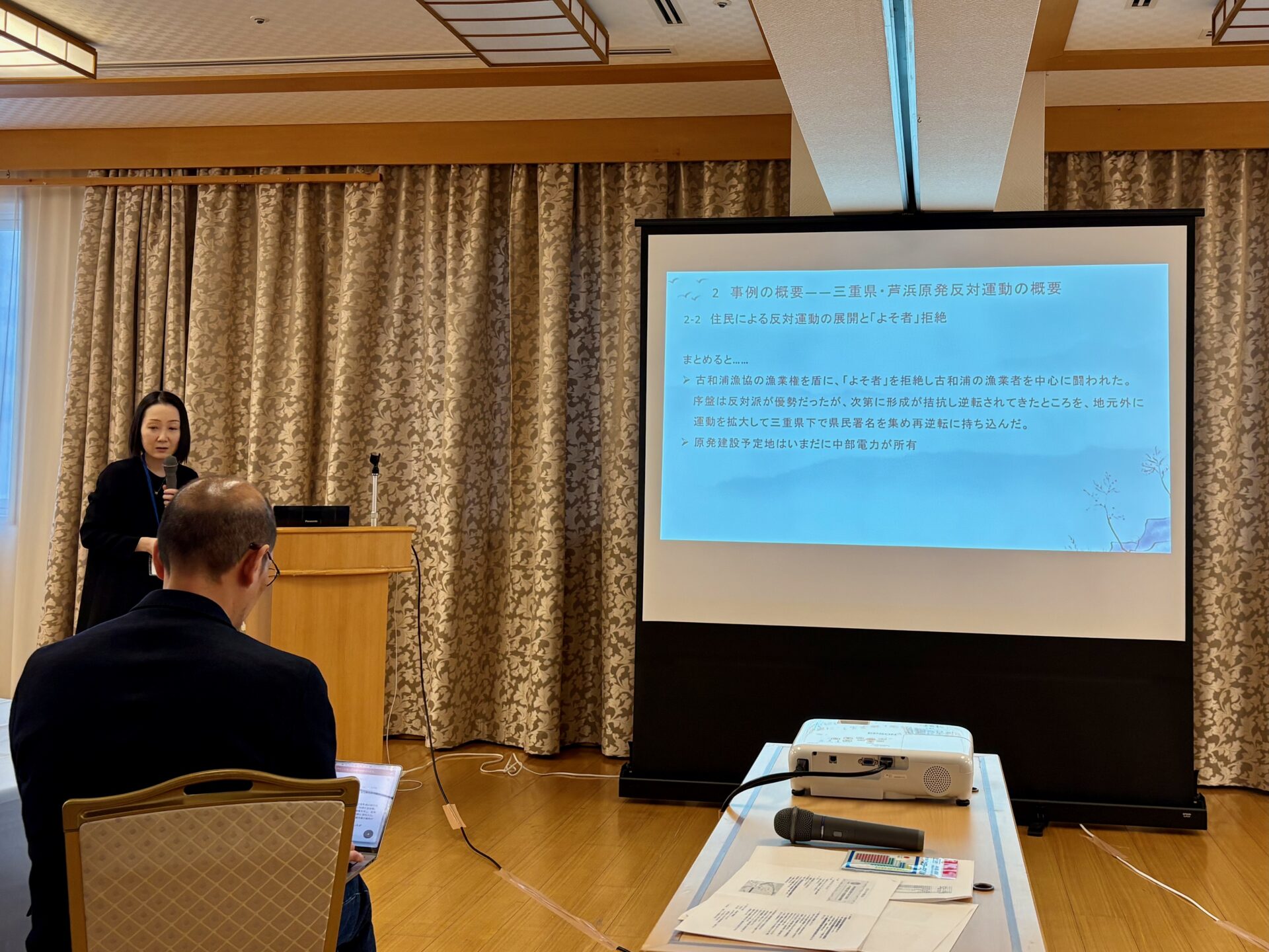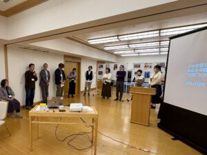 休憩を挟んで、各自が提出した写真を使いながら自己紹介をしました。その後、話題提供として青木聡子准教授(東北大学)から三重県芦浜原発反対運動の事例を、寿楽浩太教授(東京電機大学)から原子力技術者とケアの倫理に関する問題意識と見通しを、八木からは高レベル放射性廃棄物処分の候補地となっている寿都町の事例を紹介しました。参加者は話題提供で感じた疑問やコメントを付箋に書き留め、会場内に用意した模造紙に付箋を貼り、1日目のプログラムを終えました。